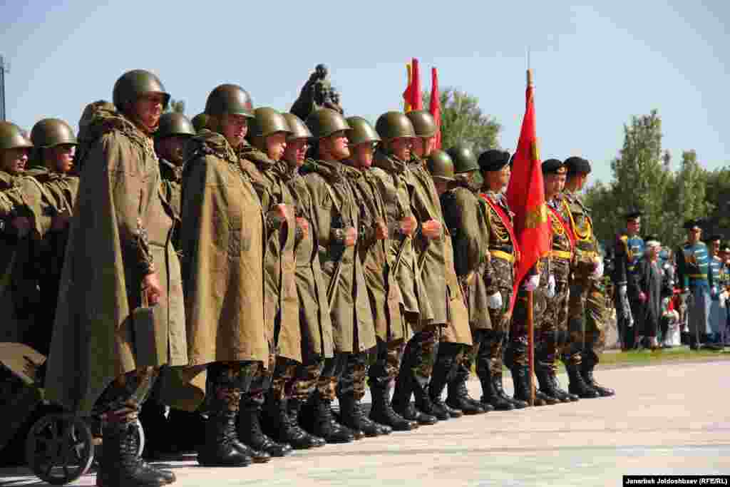 Сегодня в Бишкеке состоялось праздничное мероприятие, приуроченное ко Дню Победы. Ветеранов почтили праздничным обедом и традиционными фронтовыми 100 граммами. Кроме того, на площади Победы был организован небольшой парад военных и выступления артистов.