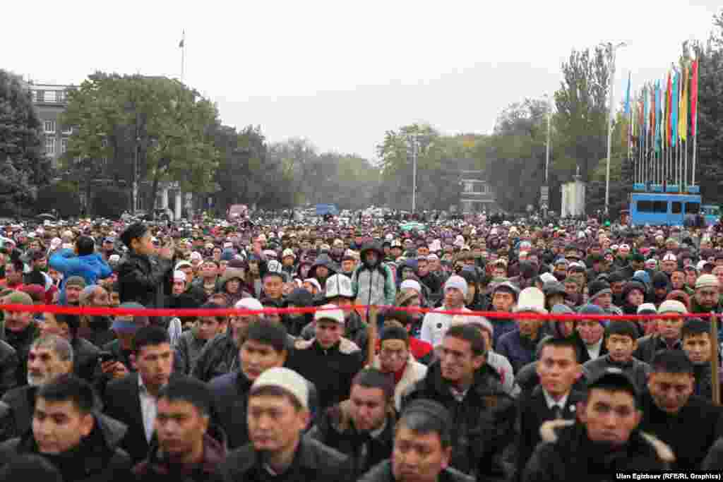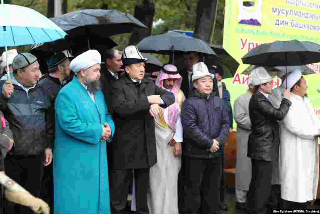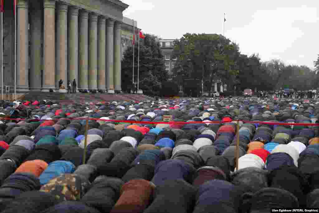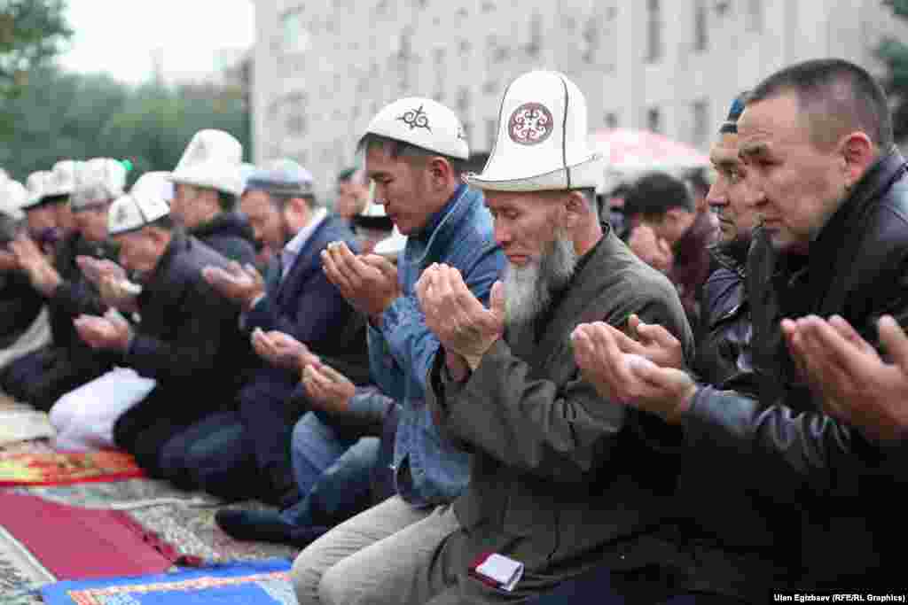 В Бишкеке с утра прошел праздничный айт-намаз. Несмотря на дождь на старую площадь пришло много людей. С поздравительной речью выступили заместитель муфтия Равшан ажы Эратов и спикер Жогорку Кенеша Асылбек Джээнбеков.