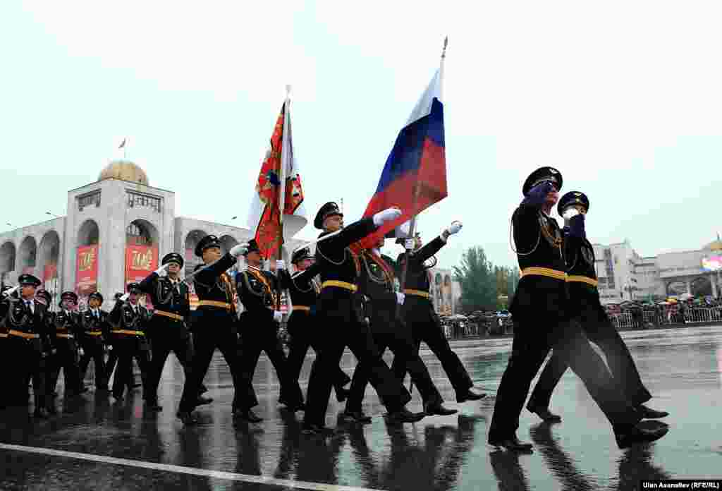 Сегодня в одном строю с военнослужащими Вооруженных сил Кыргызстана торжественным маршем по центральной площади «Ала-Тоо» прошли российские военнослужащие - парадный расчет объединенной российской военной базы в городе Канте.