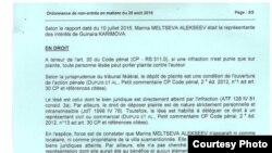 В документе, предоставленном Сафару Бекжану прокуратурой кантона Женева, приводится, что к заявлению Марины Мельцевой Алексеев от 10 июля 2015 года, где она утверждает, что является представителем, защищающим интересы Гульнары Каримовой, не приложен ни один другой официальный документ, который смог бы подтвердить её слова.