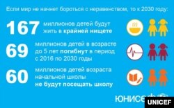 Эти последствия при нынешних тенденциях шокируют. К примеру, к 2030 году, 167 миллионов детей по-прежнему будут жить в условиях нищеты, 69 миллионов детей в возрасте до 5 лет умрут от предотвратимых в большинстве своем причин и более 60 миллионов детей начального школьного возраста так и не пойдут в школу. Но так не может продолжаться.