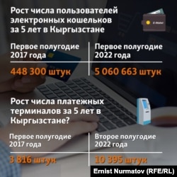 Если посмотреть на объем средств, проведенных через электронные кошельки, то за первые полгода переводы достигли 4,9 млрд сомов. И почти столько же – 5 млрд сомов - составила доля оплаты за товары и услуги. Это в 1,5-2 раза больше, чем за весь прошлый год.