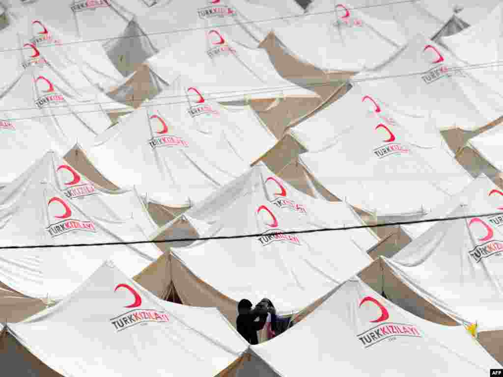 Турецкие военные охраняют лагерь беженцев из Сирии.